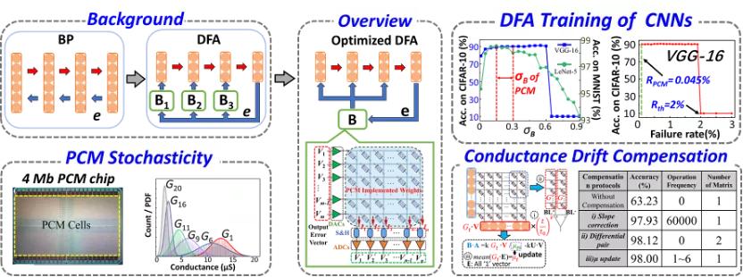 2020年12月,智源学者、北京大学杨玉超团队提出并实现了一种基于相变存储器(PCM)电导随机性的神经网络高速训练系统,有效地缓解了人工神经网络训练过程中时间、能量开销巨大并难以在片上实现的问题。该系统在误差直接回传算法(DFA)的基础上进行改进,利用PCM电导的随机性自然地产生传播误差的随机权重,有效降低了系统的硬件开销以及训练过程中的时间、能量消耗。该系统在大型卷积神经网络的训练过程中表现优异,为人工神经网络在终端平台上的应用以及片上训练的实现提供了新的方向。