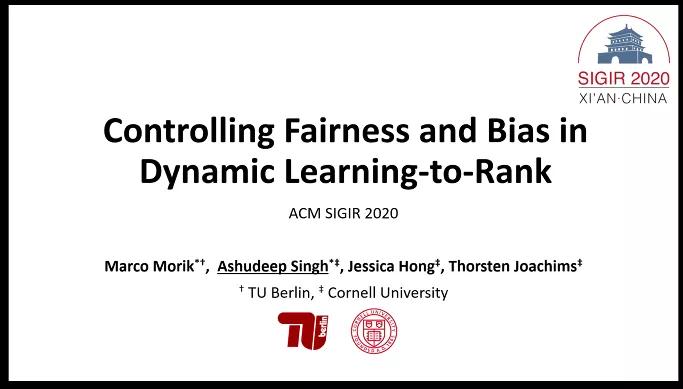 近年来,检索的公平性和基于反事实学习的检索和推荐模型已经成为信息检索领域重要的研究方向,相关的研究成果已经被广泛应用于点击数据纠偏、模型离线评价等,部分技术已经落地于阿里和华为等公司的推荐及搜索产品中。2020年7月,康奈尔大学 Thorsten Joachims 教授团队发表了公平无偏的排序学习模型FairCo,一举夺得了国际信息检索领域顶会SIGIR 2020最佳论文奖。该研究分析了当前排序模型普遍存在的位置偏差、排序公平性以及物品曝光的马太效应问题等,基于反事实学习技术提出了具有公平性约束的相关度无偏估计方法,并实现了排序性能的提升,受到了业界的广泛关注和好评。