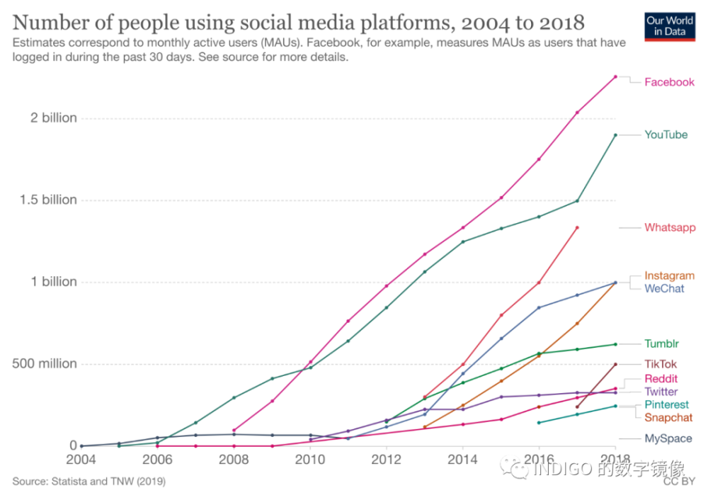 Our World in Data 这个网站组织了一份全球社交媒体十五年来变迁的数据报告,非常全面,大家有兴趣可以看看这份「The Rise of Social Media」。