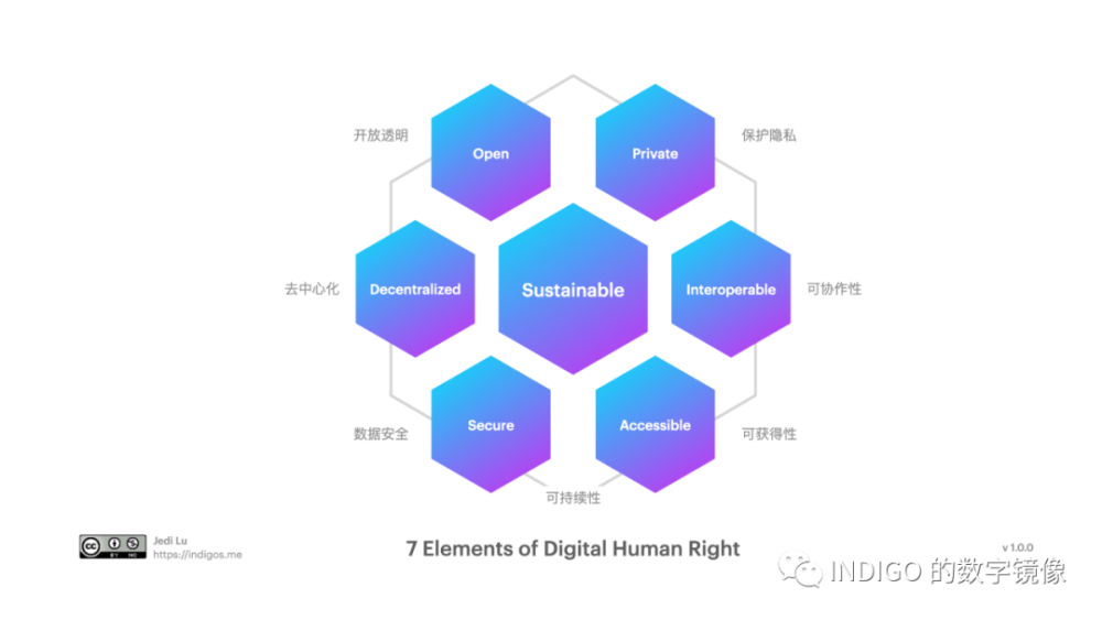 作为一名早期参与过设计社交媒体平台的产品技术人员,总喜欢用一些模块和设计原则的思路来表述问题。下面这个 Digital Human Right(数字权利)设计七要素,灵感来自一个英国的创业团队 IND.IE 的Ethical Design(原图采用 CC4.0 协议发布),我帮他们演绎了一下。