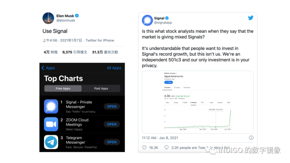 无独有偶,就在 Trump 被科技巨头们“赛博消失”之后,Facebook 突然宣布要更新 WhatsApp 的隐私协议,把用户数据分享给 Facebook。这时 Elon Musk 的一条推文就让雪藏已久的 Signal 制霸 AppStore 全北美 Free Download 的榜首,到今天依然是,而且美股同名的生物科技公司股票在当天也上涨了快 20 倍!